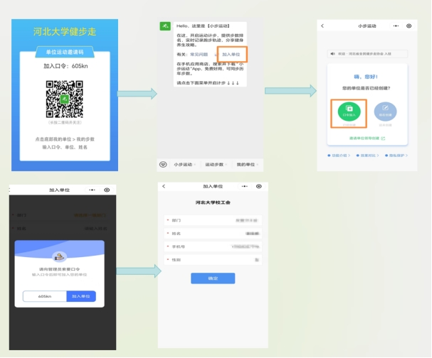 注册用户:扫描下方二维码进入小步运动小程序,找到“加入单位”点击进去,选择“口令加入”输入口令“605kn”加入“河大健步走”,完善个人及所属基层工会信息,点击“确定”即加入活动(操作步骤详见下图)。