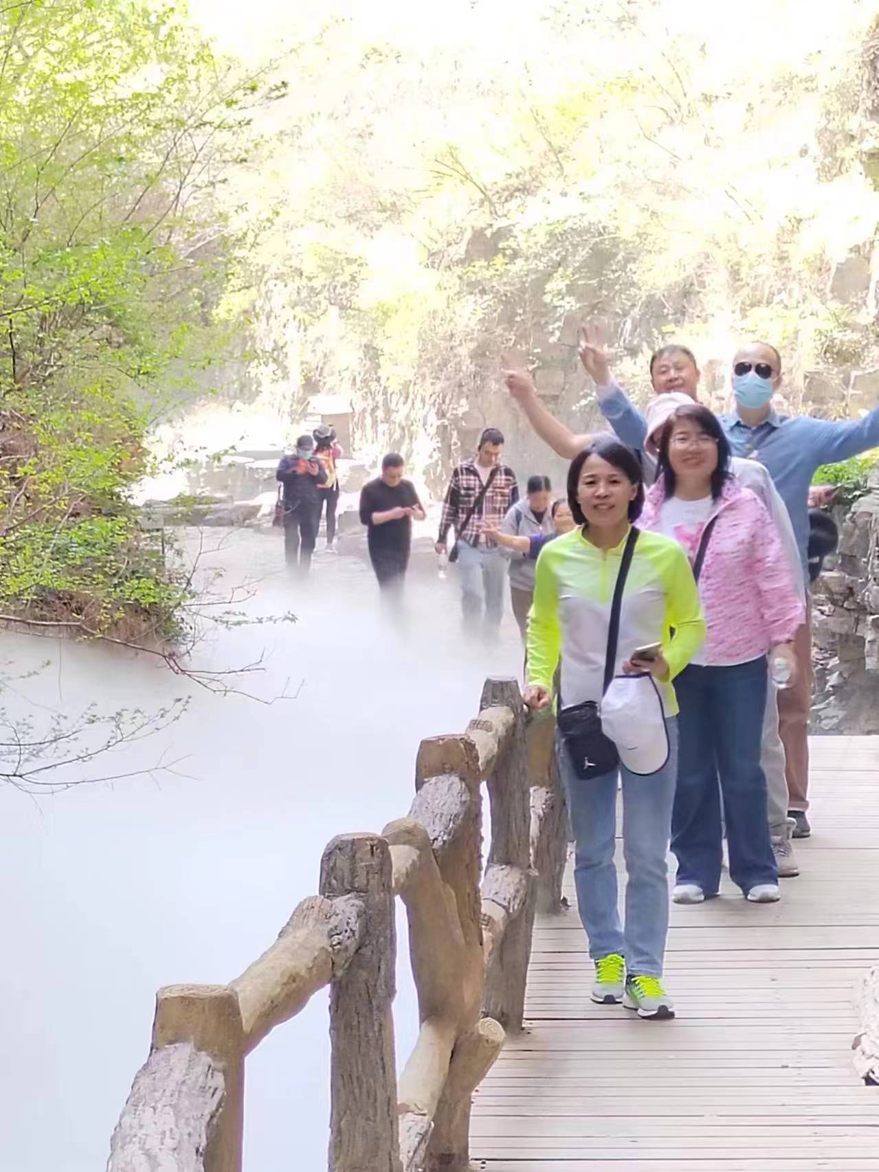 这次分工会精心选择的三妙峰景区峡谷全长十几华里,为北方罕见的喀斯特地貌。集山、谷、溪、涧、瀑为一体,山泉水自山顶一直到山脚。暮春时节的三妙峰,层峦叠翠,水声潺潺,风景如诗如画。古人云:缓步春山春日长,流莺不语燕飞忙。桃花落处无人见,濯手惟闻涧水香。大家远离尘嚣,在这郁郁葱葱的天然氧吧中尽情地呼吸着,心境也豁然开朗。山路蜿蜒,台阶密集,一路上大家团结友爱、互相扶持, 一边爬山一边欣赏大自然的美好风光,欢声笑语此起彼伏,平日里被工作束缚的灵魂在此刻得到了充分舒展。